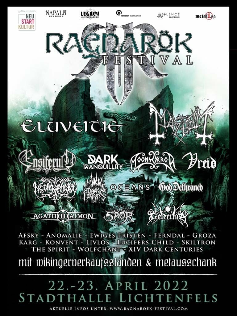 Es ziehen wieder düstere Pagan-Wolken über Lichtenfels. Zwei Jahre lang musste die oberfränkische Korbstadt ohne die inzwischen liebgewonnenen Horden von Metallern im April auskommen, nach der Covid-Zwangspause ist das RAGNARÖK FESTIVAL aber endlich wieder am Start. Organisatorisch war das zweifellos eine große Leistung, denn erst Ende März fielen die weitläufigen Beschränkungen, was Einlass und Besuchergrenzen angingen. Zudem kamen kurzfristige Absagen von WOLFCHANT, XIV DARK CENTURIES und GROZA, die aber allesamt durch die spontan eingesprungenen KANONENFIEBER, MUNARHEIM und MAAHES aufgefangen werden konnten. Dass das Festival am Ende reibungslos über die Bühne ging, spricht für die Professionalität der Veranstalter und unterstreicht den Status des RAGNARÖK FESTIVALS als eines der bedeutendsten Black-/Pagan-Festivals. [SP]