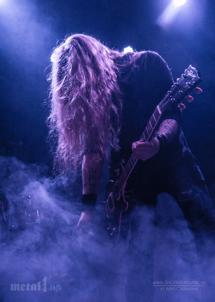 Als um 21:55 das Licht für SECRETS OF THE MOON erlischt, ist allein das schon eine Überraschung: Nach drei in blaues und grünes Licht getauchten Shows, bei denen das Lichtpult nicht angerührt wurde, ist das düster-blasse lilablau, das die dichte Nebelbank auf der Bühne nur mit Mühe durchdringt, eine willkommene Abwechslung. Kombiniert mit einzelnen Stroboskop-Blitzen hat die Show von SECRETS OF THE MOON optisch einiges zu bieten. Das ist auch bitter nötig, denn was Akustik angeht, lassen sich wenig warme Worte finden. Wer nämlich dachte, der Sound bei Thulcanda sei schlecht gewesen, wird nun eines Besseren belehrt: Bass und Bass-Drum vereinen sich zu einem alles verschlingenden Dröhnen, das nicht nur Gitarren und Gesang, sondern auch das Zwerchfell in die Knie zwingt. Wo auf Album kraftvolle Riffs erklingen, wummern heute gerade in den harten Doublebass-begleiteten Passagen niederfrequente Druckwellen durch den Club. Mag der Sound beim Mischer, oben auf der Empore, vielleicht sogar perfekt austariert sein – am Ende zählt, was beim Publikum ankommt. Ein kurzer Ausflug des Verantwortlichen hinunter ins Auditorium, wie er in diesem Fall eigentlich obligatorisch sein sollte, und die Show wäre vielleicht zu retten gewesen. So jedoch sind eigentlich nur die ruhigen Songs erträglich. Nicht nur in diesem Kontext gewinnt das Set von SECRETS OF THE MOON enorm durch das neue Material von „Sun“, wie den Abschließenden Hit „Man Behind The Sun“, der der Zwerchfellmassage nach einer guten Stunde das (leider) lange herbeigesehnte Ende bereitet. Absolut schade, hätte die Show in Sachen Licht, Stageacting und Setlist doch ansonsten durchaus das Potential zu einem beeindruckenden Live-Erlebnis gehabt.