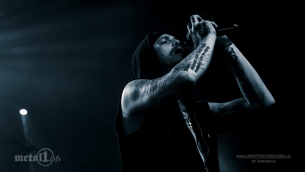 Ganz ohne Rockstar-Gehabe geht es bei SHINING dann doch nicht: Obwohl alles schon viel früher fertig gewesen wäre, lässt Kvarforth sein Publikum stolze 45 Minuten warten, ehe er nach einem fast lieblichen Intro die Bühne betritt. Ob es am Opener „Yttligare Ett Steg Närmare Total Jävla Utfrysning“ vom Meisterwerk „V: Halmstad (Niklas angående Niklas)“ liegt, der direkt zündet, oder an Kvarforths verstörender Ausstrahlung – warmlaufen muss sich hier jedenfalls keiner. Vor allem nicht Niklas Kvarforth selbst: Davon, dass er vor der Show wegen Rückenschmerzen noch kaum aus dem Stuhl aufstehen konnte, ist nichts mehr zu merken. Die stattlichen Mengen Alkohol, die er im Laufe der Show vernichtet, dürften daran ihren Anteil haben – wie auch das weiße Pulver, das er gelegentlich am Bühnenrand konsumiert.