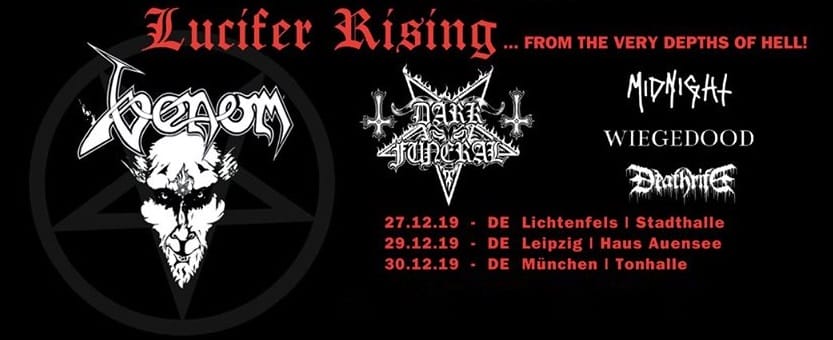 Wer das Konzertjahr mit Weihnachten als beendet ansieht, hat die Rechnung ohne VENOM gemacht: Gemeinsam mit den schwedischen Black Metallern DARK FUNERAL sowie einem attraktiven Vorprogramm aus MIDNIGHT, WIEGEDOOD und DEATHRITE spielen diese zum Jahresausklang noch drei Shows. Am 30.12.19 macht die „Lucifer Rising“-Tour in der Tonhalle München halt.
