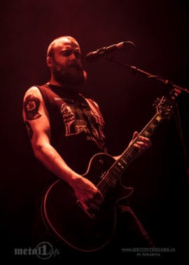 Das hat einerseits den Grund, dass Frontmann Cronos diesmal auf Lederriemen und andere Accessoires verzichtet und schlicht aussieht, als sei er unterwegs zum nächsten Studiotermin – und andererseits, dass VENOM als einzige Band an diesem Abend tatsächlich mit dem Publikum reden. Und wenn Mr. Lant zwischen den kompromisslosen Geräuschwalzen dann mit typisch britischer Selbstironie aus dem Nähkästchen plaudert, ist das geradezu entwaffnend charmant. Da verzeiht man der Truppe auch gerne ihre ansonsten trotz fast inflationärem Pyroeinsatz etwas starre Bühnenpräsenz und eine Setlist, die gleich zu Anfang mit „Black Metal“ den wichtigsten Song der Truppe verballert. Ansonsten werden immmerhin vier Songs vom aktuellsten VENOM-Album geboten, mit „Bloodlust“ und „In Nomine Satanas“ gibt es exklusive Singles von 1982 und am Ende darf noch zu „In League With Satan“ geschunkelt werden. Weil der Sound bis zum Schluss reichlich matschig bleibt und die Setlist ein paar echte Hits der Truppe vermissen lässt, hat der Auftritt von VENOM durchaus seine Längen – die Spielfreude der Formation und die ursympathischen Ansagen machen das jedoch weitgehend wett. [TM]
