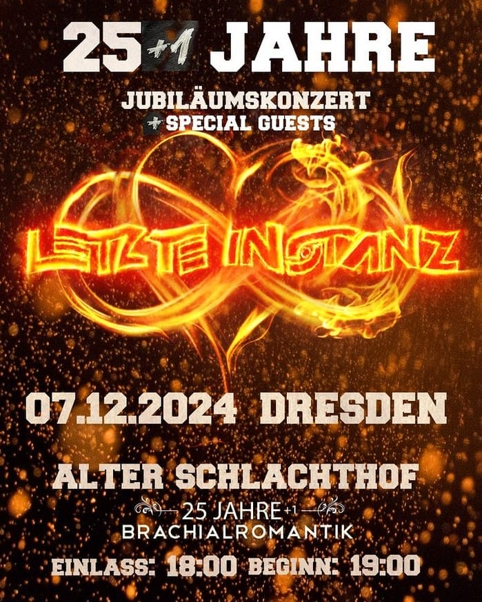 LETZTE INSTANT haben bekanntgeben, 2024 ihr 25-jähriges Bandbestehen – mit einem Jahr Verspätung – feiern zu wollen. Dazu wird die Band am 07. Dezember 20234 eine Jubiläumsshow im Alten Schlachthof, Dresden spielen. Hier die Ankündigung im Wortlaut: