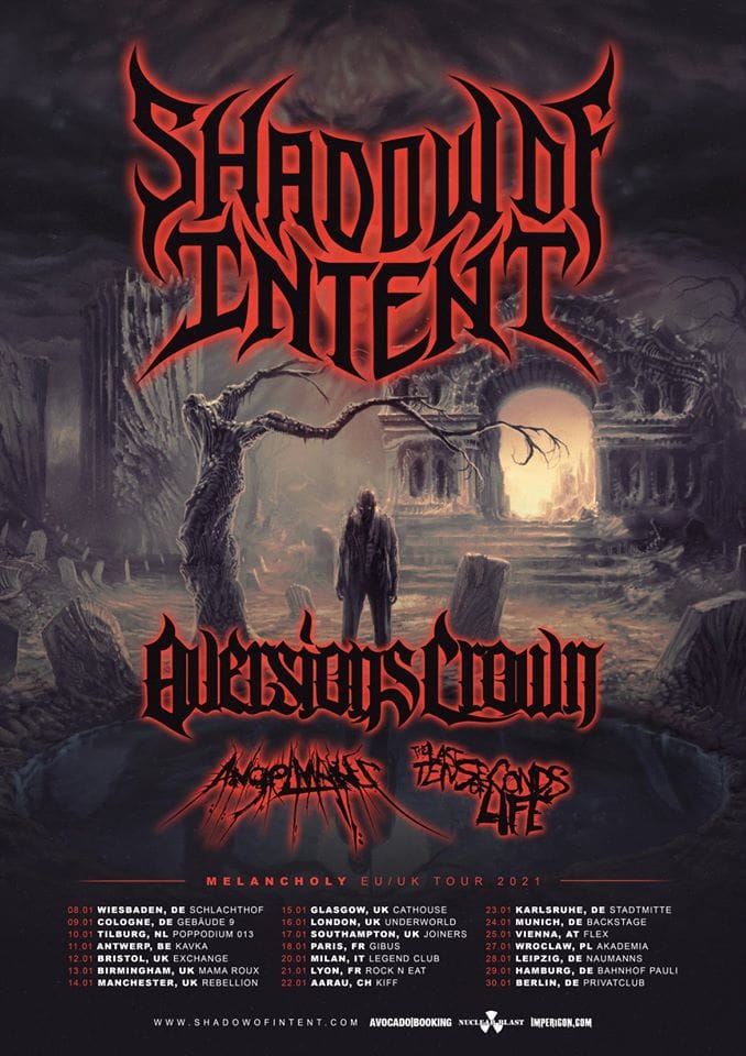Eigentlich hätte es schon zur diesjährigen Festivalsaison passieren sollen, da diese aus bekannten Gründen geplatzt ist, betreten die amerikanischen Symphonic-Deathcoreler SHADOW OF INTENT nun im Januar 2021 erstmals europäischen Boden. Auf der Tour zu ihrem aktuellen Album „Melancholy“ verschlägt es sie in sieben deutsche Städte sowie je ein Mal nach Österreich und in die Schweiz. Mit an Bord sind die Australier AVERSIONS CROWN, die kanadischen Death-Metaller ANGELMAKER sowie ihre amerikanischen Landsmänner von THE LAST TEN SECONDS OF LIFE.