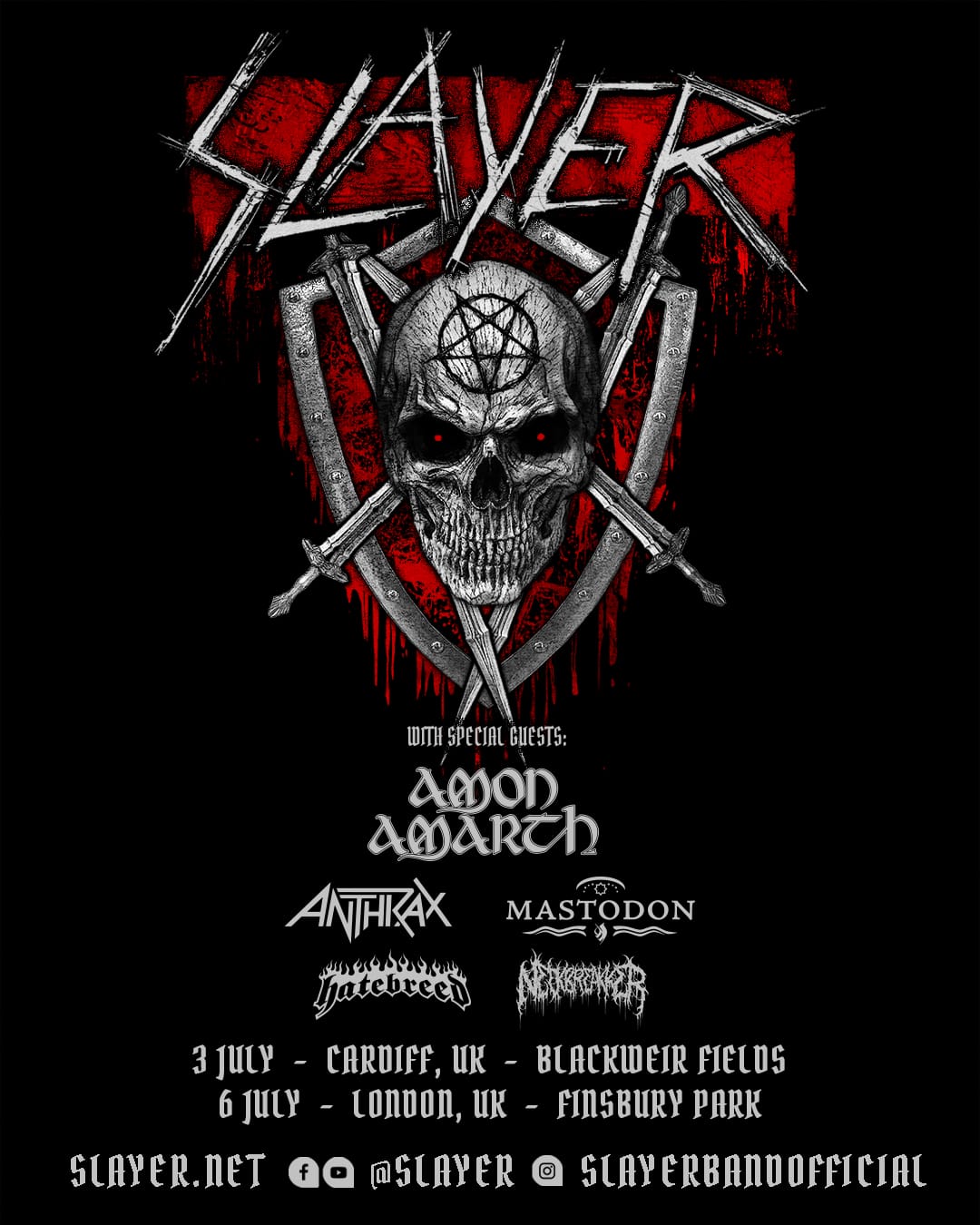 Die wiedergekehrte Thrash-Band SLAYER wird für zwei Headliner-Shows nach Europa kommen – genauer gesagt nach England. Die beiden Shows werden nicht nur die bislang größten der Band in England sein, sondern auch die einzigen Headliner-Shows in Europa in diesem Jahr sein. Als Gäste bringen SLAYER gleich fünf Bands mit: AMON AMARTH, ANTRHAX, MASTODON, HATEBREED und NECKBREAKKER: